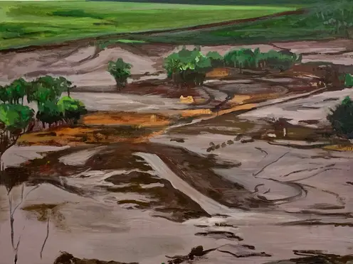 Algum lugar, lugar algum é uma série composta de pinturas a óleo sobre tela de formatos distintos feitas entre 2019 e 2020. A série toda produz uma sensação de suspensão, desestabilizando o espaço representativo numa alusão à desestabilização da esfera política brasileira do últimos anos. A paisagem se revela em meio a destroços, revolta, espécie de terra devastada ainda incapaz de mostrar uma unidade e ser lida de modo que faça sentido. A princípio desencadeada pelo desastre ambiental em Brumadinho (MG/Brasil), a série extrapola a referência geográfica, constituindo-se muito mais como metáfora do desmonte que as instituições brasileiras vêm sofrendo e a desesperança que, nesse momento, assola o País.